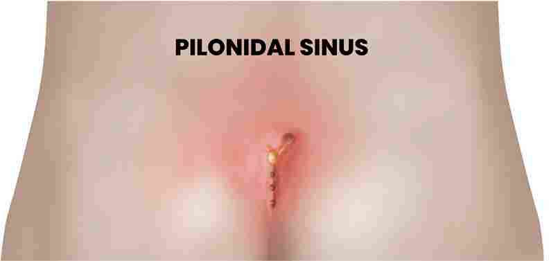 Sinus or pit: A small opening or depression in the skin, often located at the top of the cleft between the buttocks. It may appear as a small dimple or a red swollen area. Pain and discomfort: The affected area can be painful, especially when sitting or moving. The pain may range from mild to severe. Inflammation and redness: The area around the sinus can become inflamed, swollen, and tender to the touch. It may appear red and warm. Drainage: Pus or fluid may be present, and there can be intermittent drainage from the sinus tract. This can cause a foul odor. Abscess formation: In some cases, the sinus may become infected and form an abscess, which is a painful, swollen, and pus-filled area.
