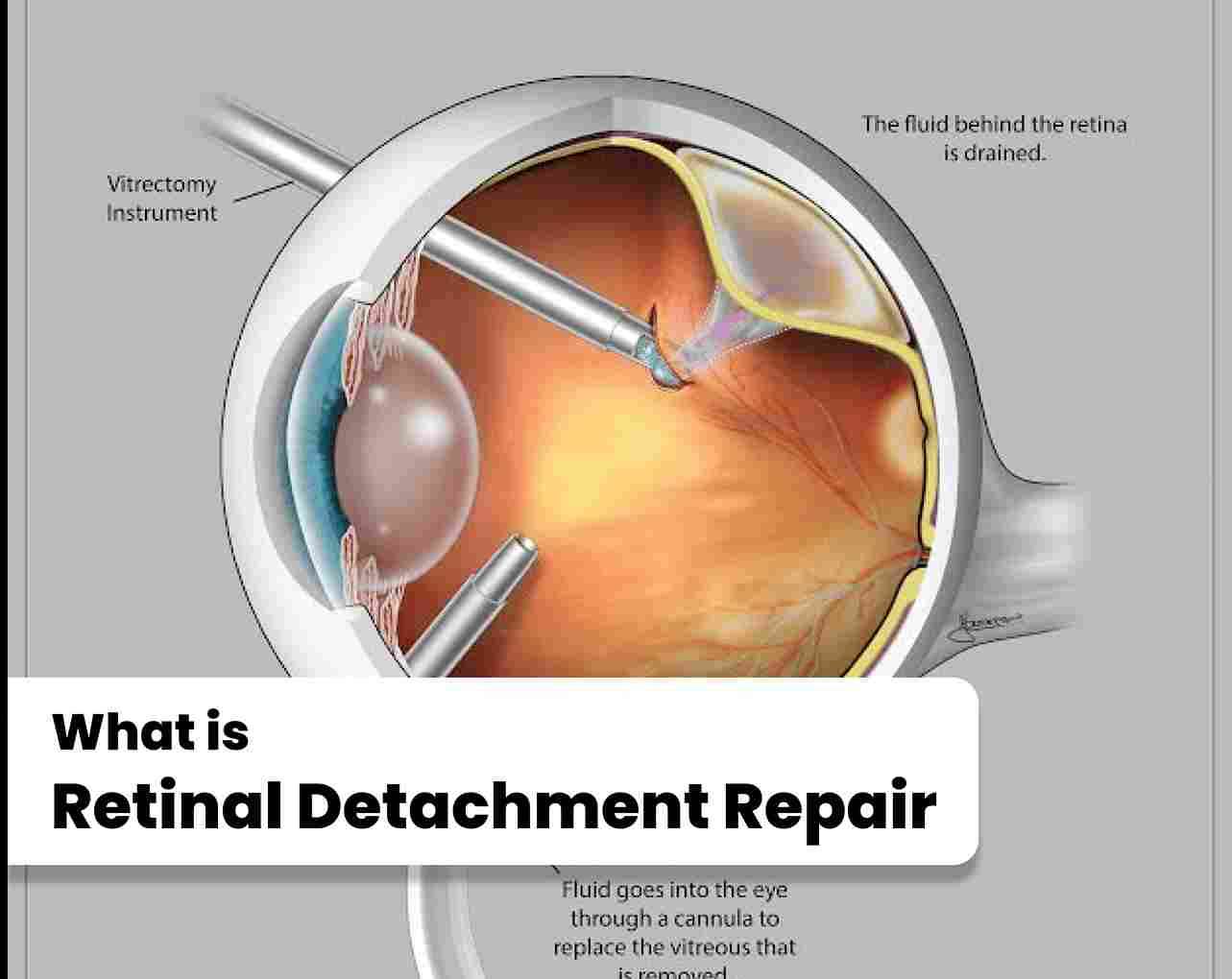 Retinal detachment repair is a surgical procedure that is performed to reattach the retina to the underlying tissue in the eye. Retinal detachment occurs when the retina, the thin layer of tissue that lines the back of the eye and is responsible for converting light into neural signals that the brain can interpret as visual images, separates from the underlying tissue. This separation can occur due to trauma, age-related degeneration, or other conditions that cause the retina to become detached. Retinal detachment repair surgery is typically performed under local anesthesia and may involve several different techniques, depending on the location and severity of the detachment. One common technique is called scleral buckling, which involves placing a silicone band around the eye to support the area where the retina is detached. Another technique is called vitrectomy, which involves removing the vitreous gel that fills the eye and replacing it with a clear fluid to provide better visualization of the retina during the repair. After the surgery, patients may need to keep their head in a certain position for a period of time to allow the retina to heal properly. They may also need to avoid certain activities, such as lifting heavy objects or straining, until the eye has fully healed.